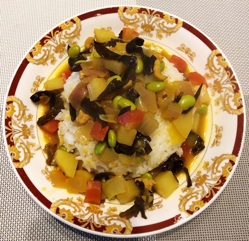 5:把煮好的咖喱鸡肉杂蔬淋在饭上即可。