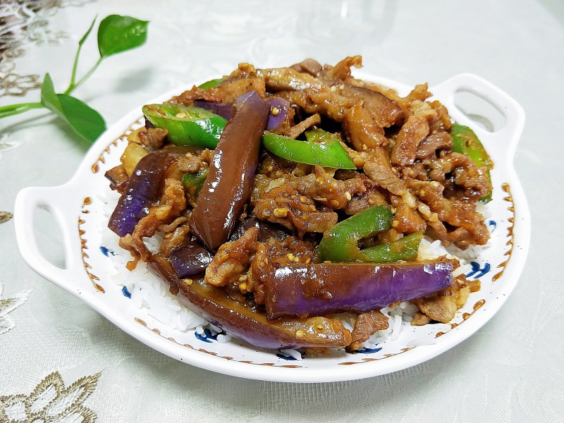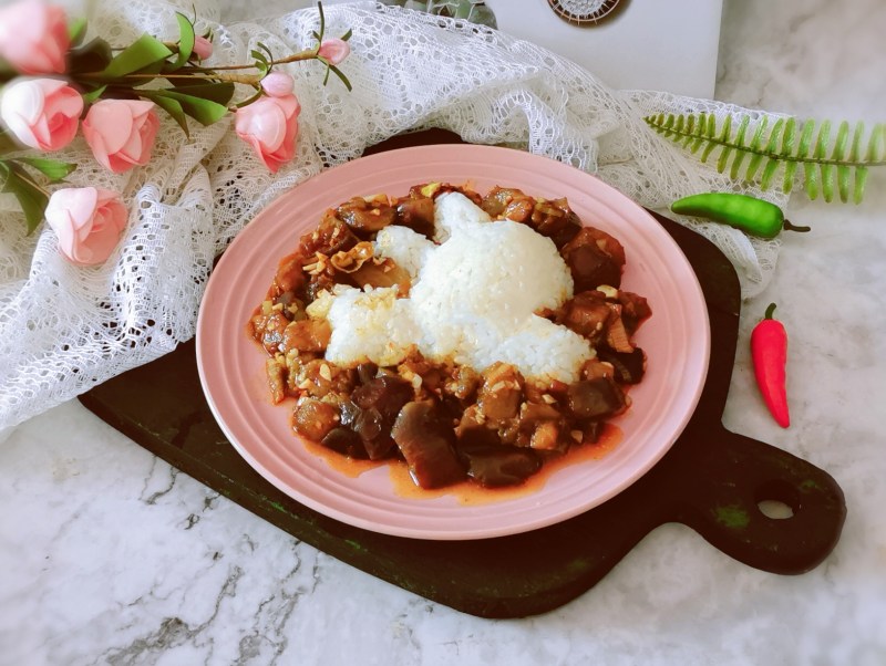 13:放入炒好的茄子,一份可口的茄子盖饭就做好了。