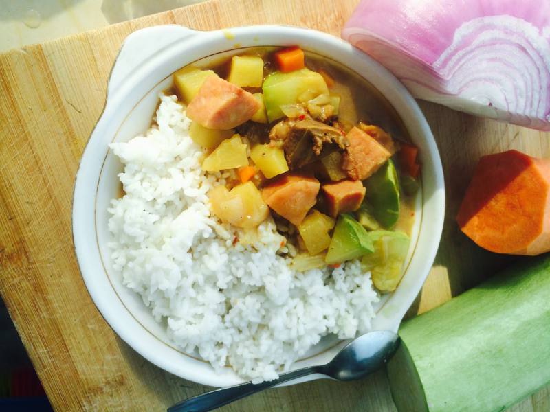 2:家里有的蔬菜一样来一点,有什么放什么,可以切丁、切块,怎么喜欢怎么切。加入开水煮,放入咖喱酱调味,焖10分钟即可。