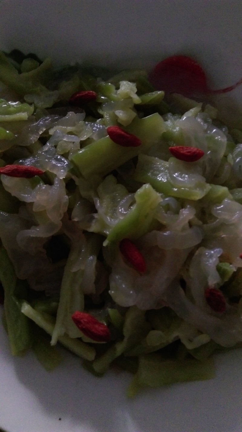 1:菜市场买的处理好的新鲜海蜇丝,溜元一斤,这玩意都是水很重,两斤焯水都不剩多少了,但比加海盐保鲜的好吃。