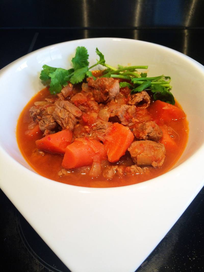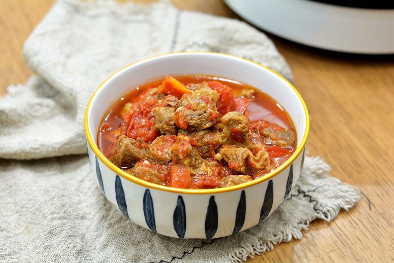 4:高压锅闷熟,炒锅放油炒熟番茄酱,放番茄块翻炒,加入牛肉和适量原汤,炖煮约5分钟,出锅撒香菜。