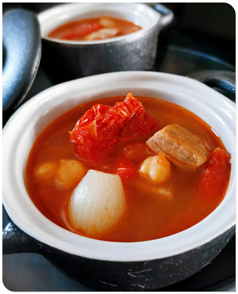 6:下入番茄块和洋葱块,再炖煮15分钟,加入鸡精、盐即可。