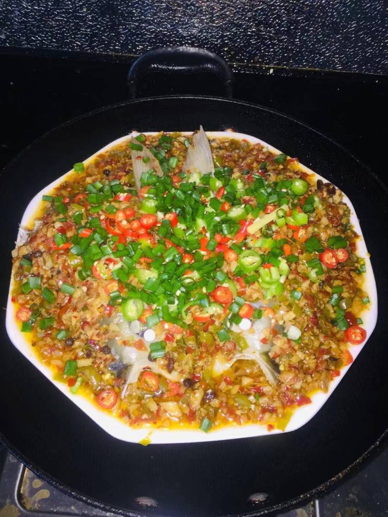 12:蒸好的鱼头淋上热油(180度)。
