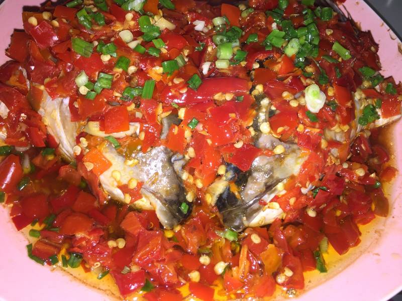 7:蒸好的鱼头上撒上葱,蒜丝,浇上热油即成。