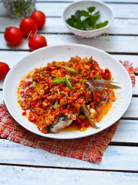 5:腌制好的鱼冲洗干净,把调好的剁椒均匀的铺在鱼头上