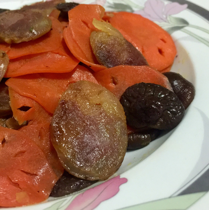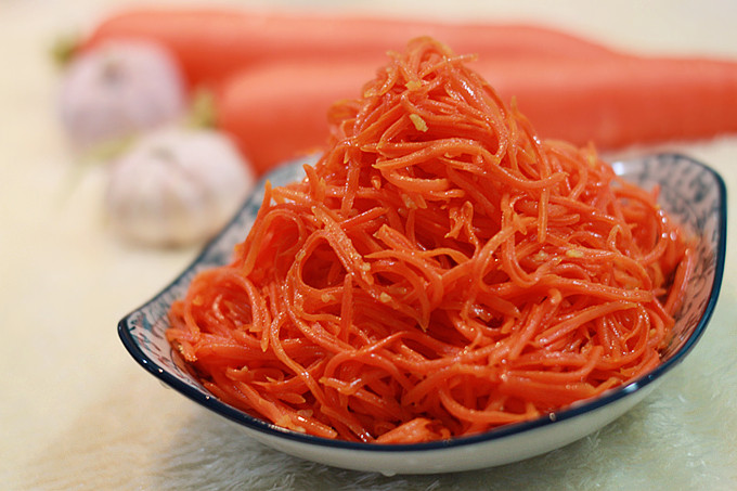 胡萝卜是素食中滋味鲜美的菜之一,独用大蒜调味,滋味更加的鲜美,这里突显大蒜的风味,蒜分两次下锅,且大蒜一定要用蒜米来烹。
