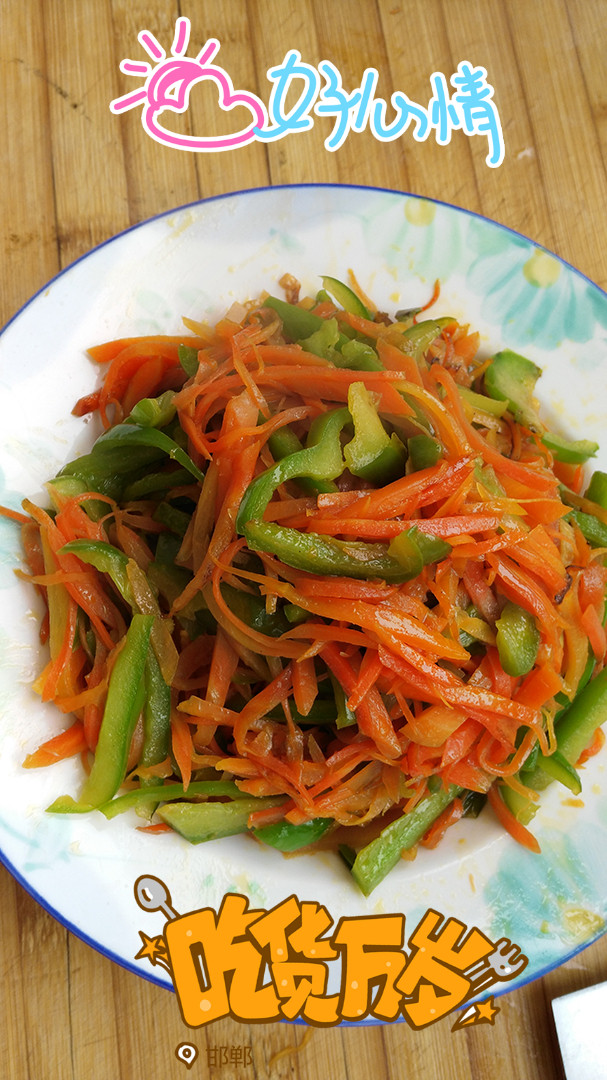 4:胡萝卜快熟时放入青椒,翻炒几下,再放入盐和味极鲜,因为味极鲜很咸,盐一定要少放。