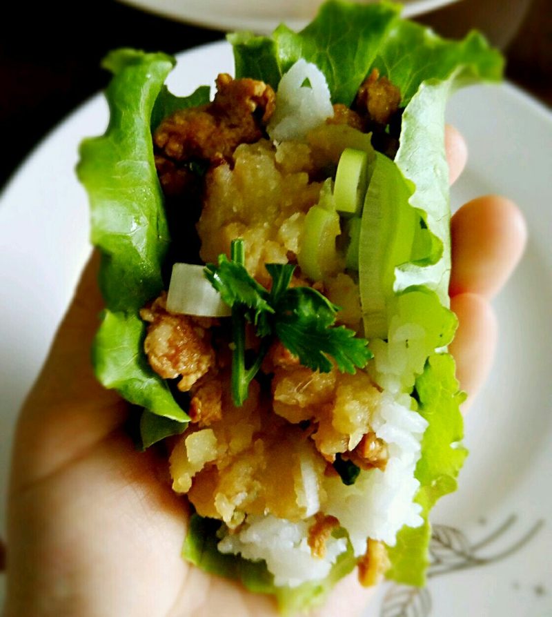 6:将米饭、葱花、香菜段,鸡蛋酱,土豆泥各取一些到盘中,拌匀,用生菜叶包起一团混合的米饭,即可以享用美味啦!