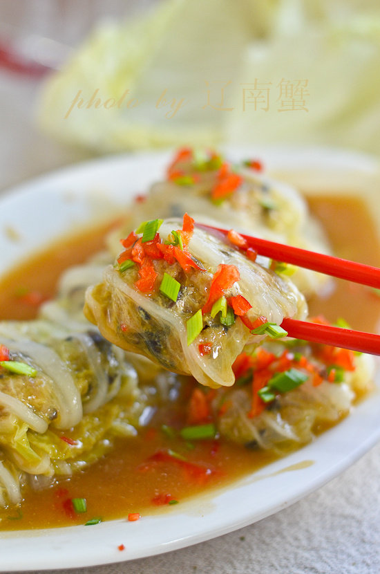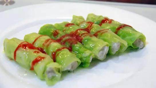 7:蒸好的菜卷。倒出汁入炒锅,加水淀粉勾芡,浇在盘中菜卷上。