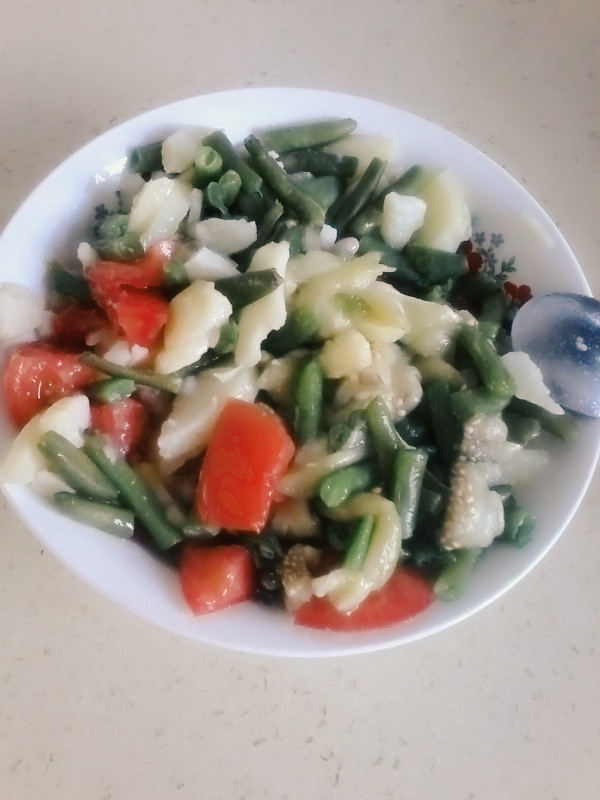 豆角适量;西红柿一个;盐适量;香油几滴;