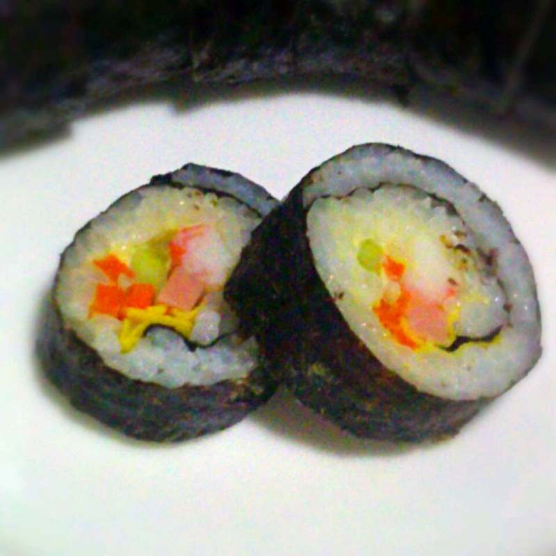 6:竹帘上放紫菜皮,比较光亮的一面朝下。因为米饭加醋后比较粘连,最好准备两把饭铲,可以比较方便的取用米饭,并把米饭摊的比较平整,而且制作时比较利爽。在紫菜皮的上面留1cm左右的空白,其他地方的边角也要填满。距下面1/3处抹上一条上面准备的沙拉酱和芥末的混合酱,然后把相应的材料码齐。用双手大拇指提起寿司帘下端,用其余四指压紧材料,慢慢卷制收紧使紫菜皮下端的边全部收进后逐步用擀面的动作卷好,整形后再用卷帘卷几下使得成品更加紧实。如果刀快,可以蘸水直接切卷好的寿司。如果刀不够快则需要把寿司先放冰箱理冻一个小时左右再切就比较方便了。