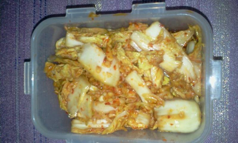 6:拌好的娃娃菜用保鲜盒装起来放入冰箱冷藏,24小时后即可享用了,腌的时间越长味道越好,我们用来做泡菜饼实在太好吃了