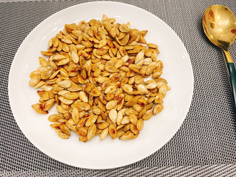 2:放入锅中,小火翻炒,加入适量盐,不断翻炒,防止糊,南瓜籽变焦黄即可。