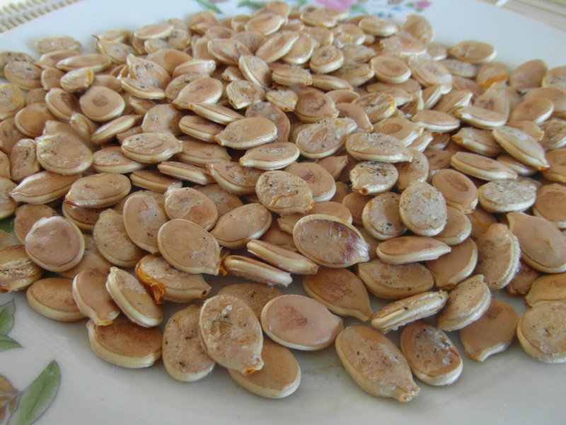 1:挖出南瓜子,水中浸泡,去除种子上的粘液,去除不实成的种子。浸泡的时间很随意,有时间可以马上洗净,没时间可以泡上半天。