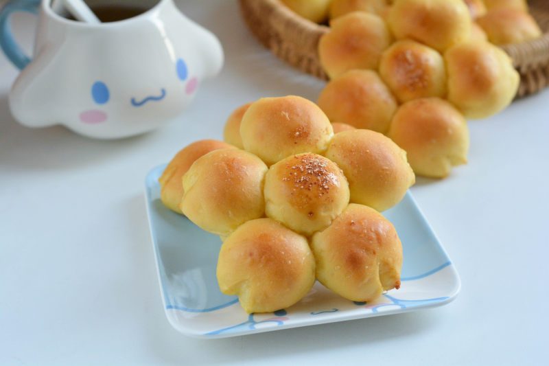 14:出炉后趁热在5个花瓣上刷少许黄油融液,此时面包非常软,稍不小心就会把花瓣面团碰下来,所以待面包冷却后再从烤盘里取出;