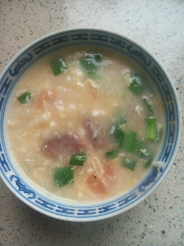 1:番茄、韭菜洗干净,切好备用。香肠切丁备用。