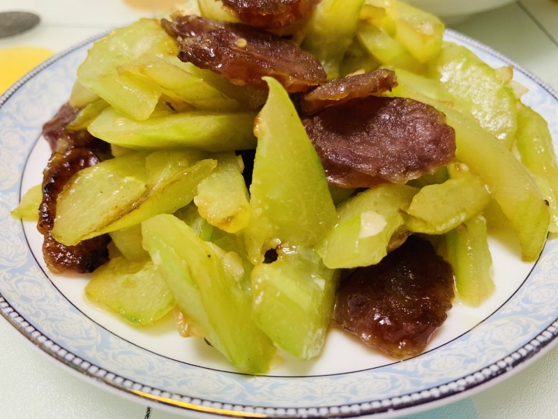 4:倒腊肠片进去煸炒几下,出油飘香。
