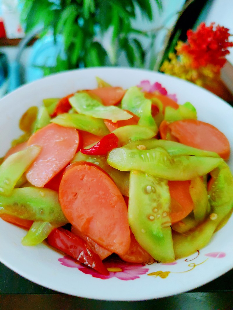 5:加入火腿肠翻炒均匀,翻炒到表皮微微变焦