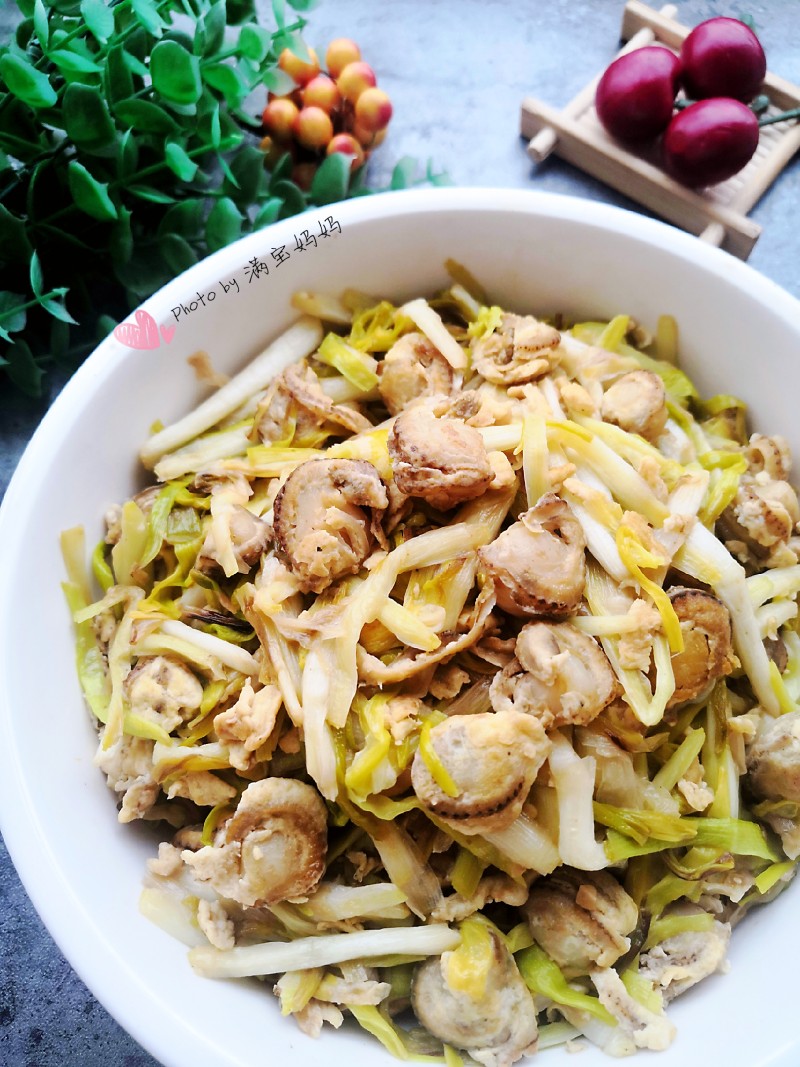 5:倒入扇贝肉翻炒均匀,加入盐,耗油,料酒,糖继续翻炒入味即可。
