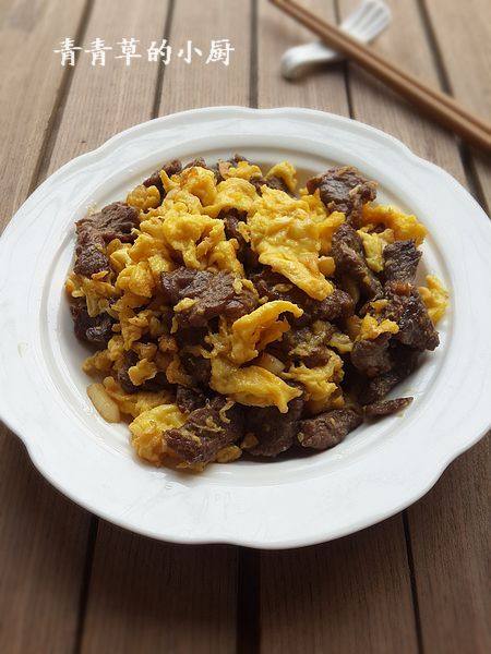 5:加入牛肉快速翻炒,由于要拍照,我的鸡蛋老了,变成了炒蛋不是滑蛋了。