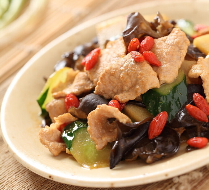猪肉100g;黄瓜100g;冬笋100g;黑木耳10g;枸杞子10g;