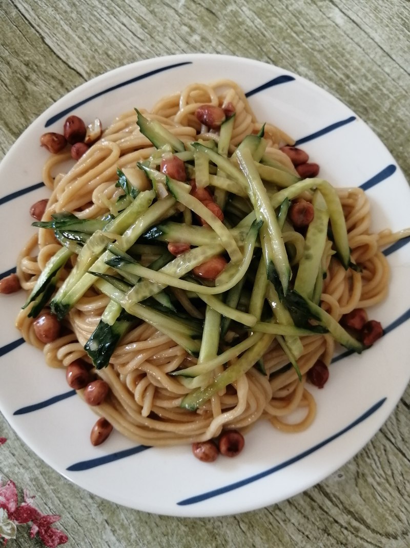 黄瓜丝适量;胡萝卜丝适量;葱油适量;辣椒油适量;香油适量;香菜末适量;蒜末适量;芝麻适量;糖 盐 醋 生抽适量;