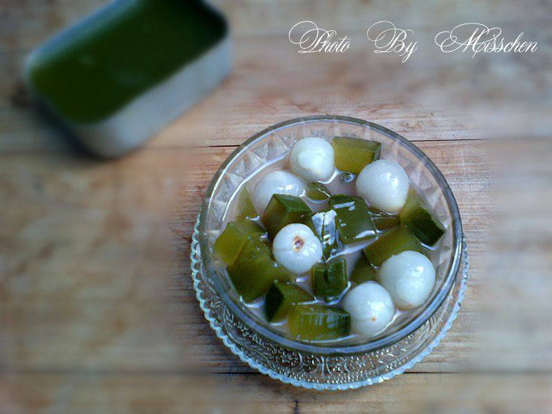 6:吃时用刀划成小块,我加了蜂蜜水、巧克力炼乳、荔枝。放入冰箱冷藏口感更佳
