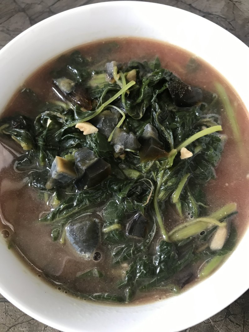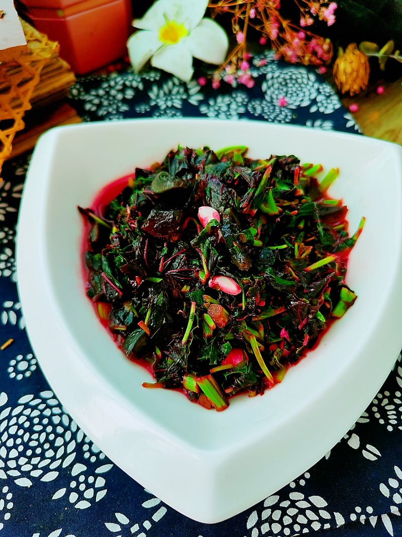 8:红苋菜煮烂后加入皮蛋粒一起煮。