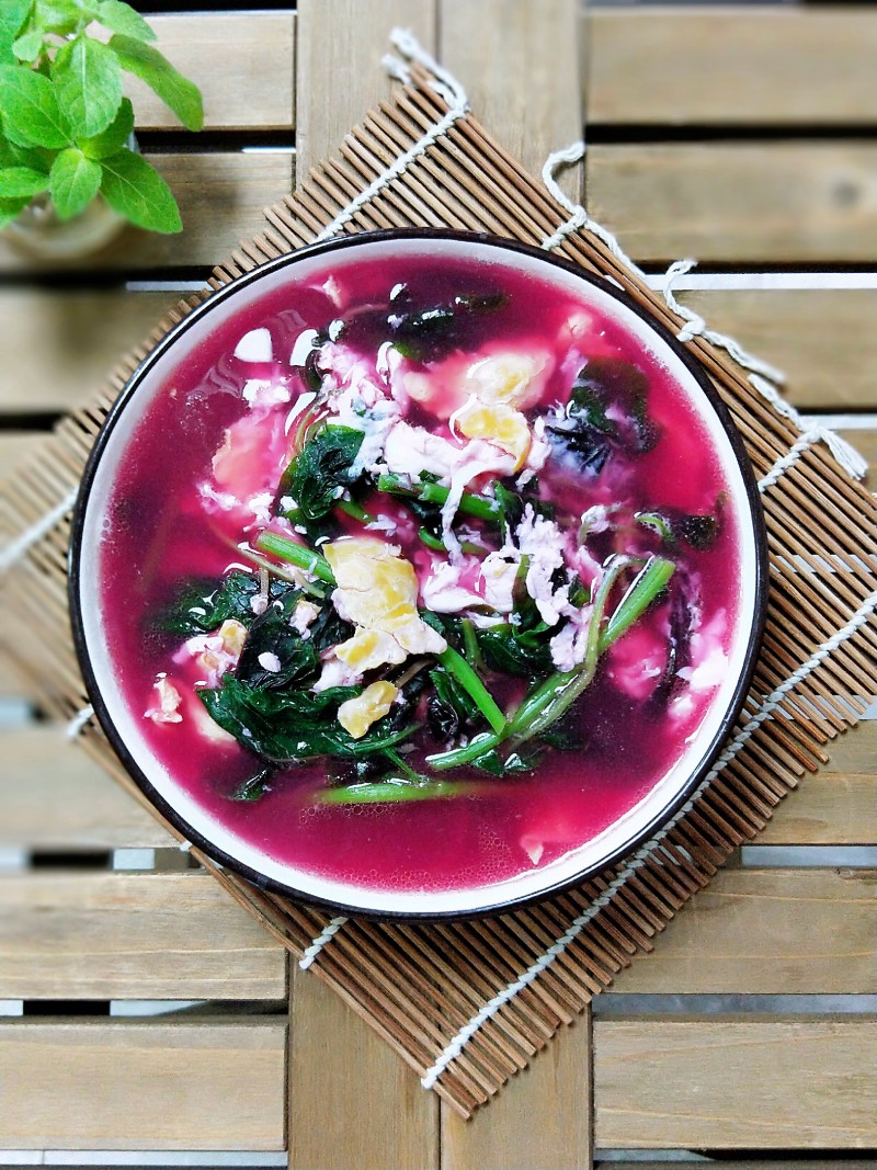 6:这道健康营养,秀色可餐的鸡蛋苋菜汁捞面就可以享用了。