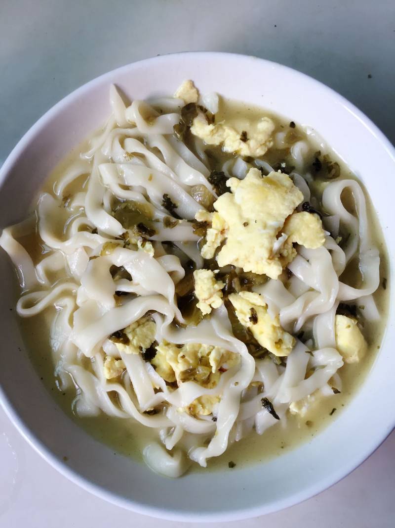 4:下锅烧啦,锅里放少许油(我放了昨天剩下的鸭油)油热后放入咸菜翻炒几下后加适量水,水滚后将面条放入,再将鸡蛋放入