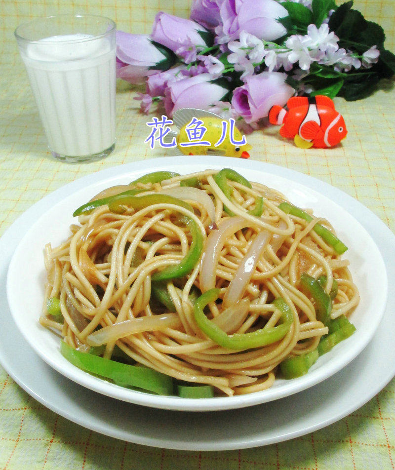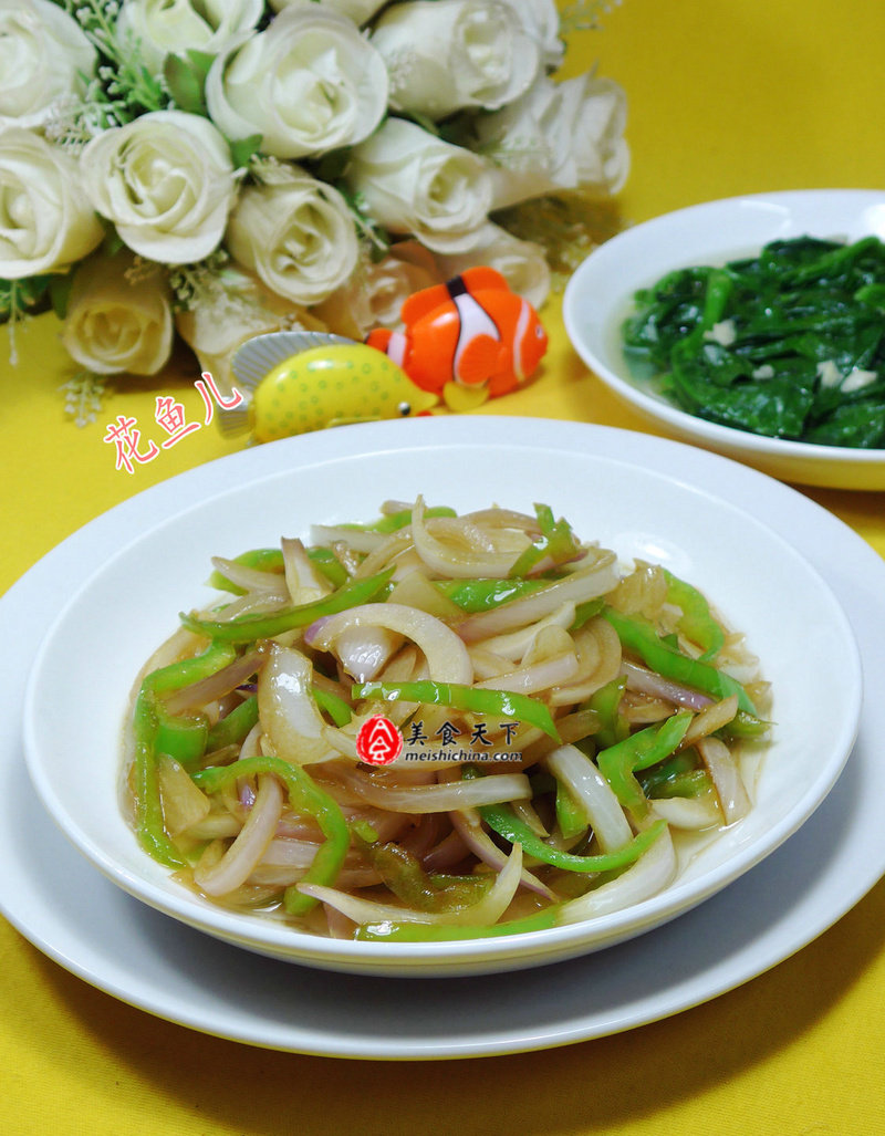 3:锅烧热放少许油,倒入青椒和洋葱加少许盐和生抽调味,翻炒几下即可。