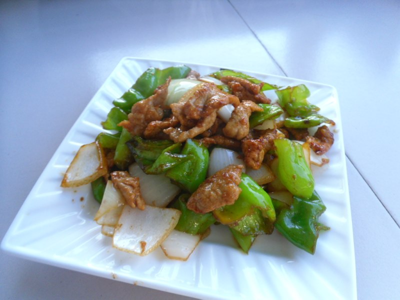 6:爆炒熟肉片之后放入洋葱和甜椒青叔,翻炒3分钟即可。