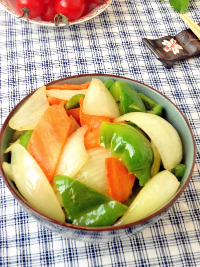 洋葱1个;青尖椒3个;酱油少量;甜椒2个;黄酒1小勺;