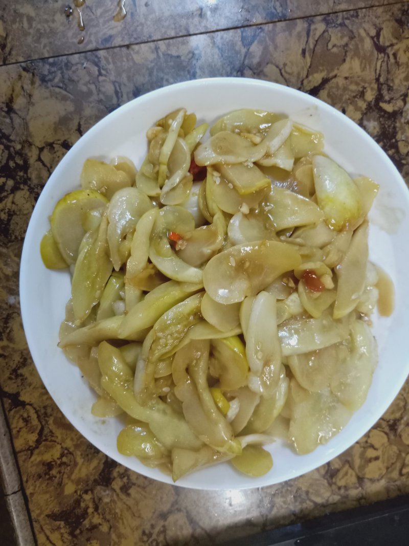 蛇瓜2棵;豆瓣2勺;蚝油1勺;葱1棵;红辣椒4个;醋2勺;