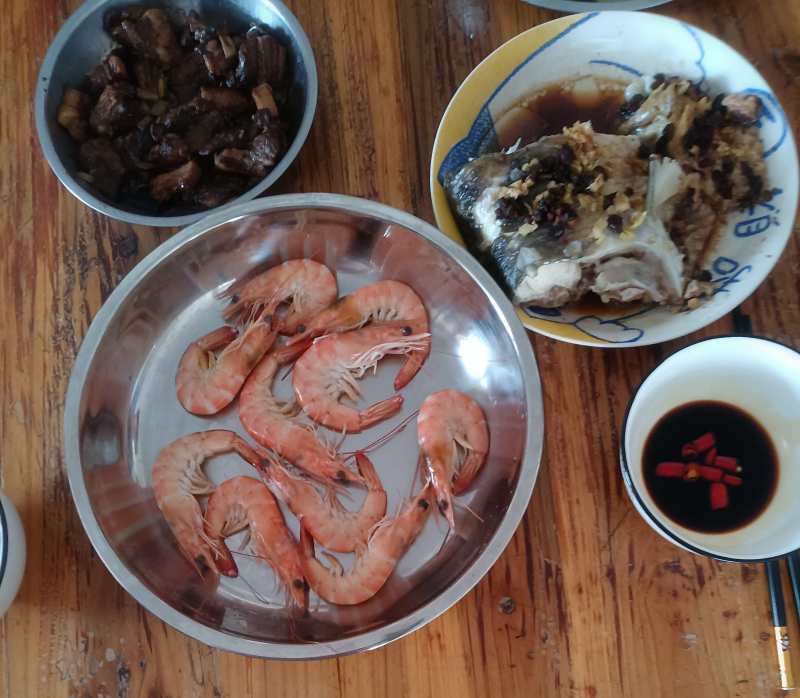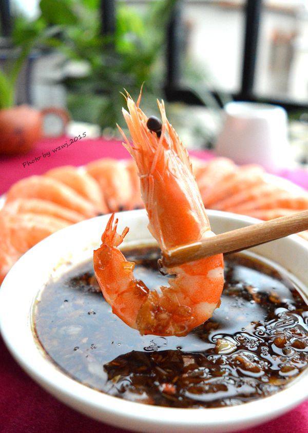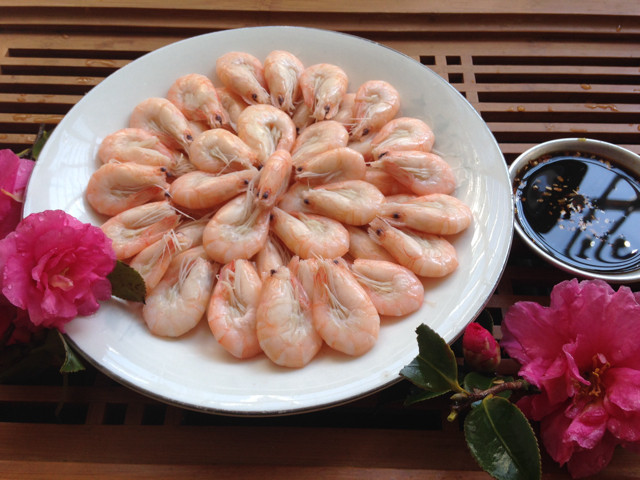 4:煮熟的白虾摆盘,以酱汁蘸食,是温州人最典型的吃法。