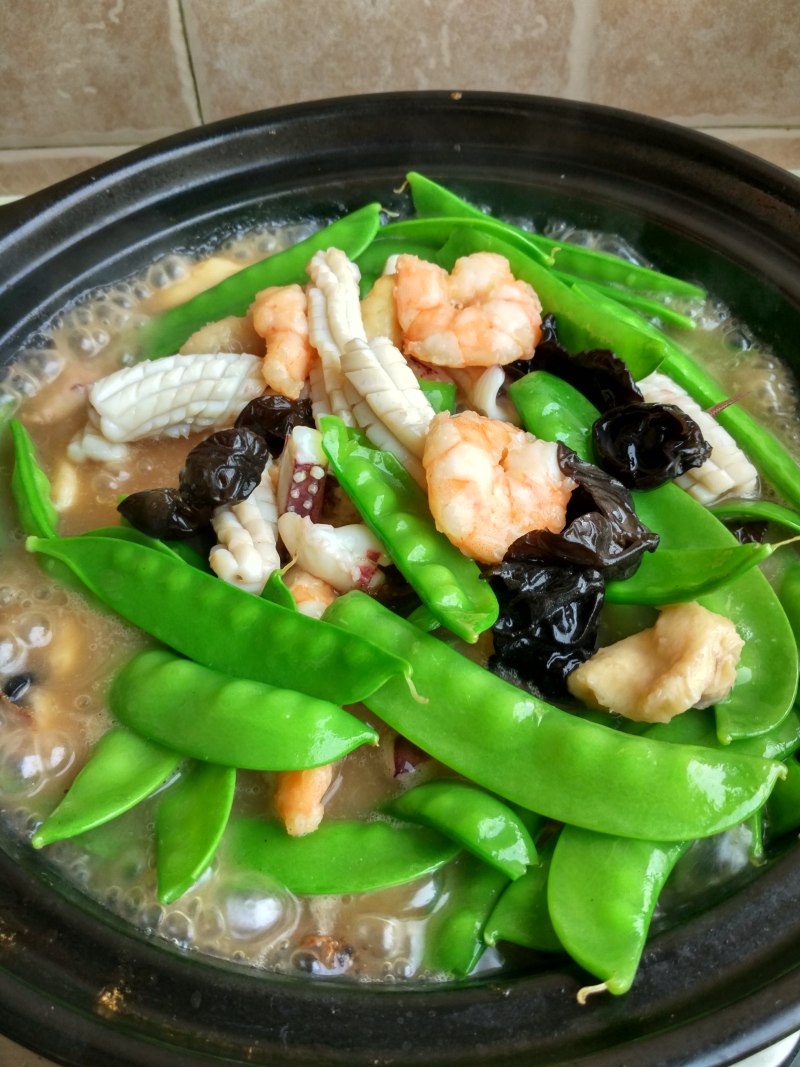 4:煲内加水(普通锅也可以),加入200克水,放入2克盐,把木耳放入,鸡汁倒入烧开,放入虾仁鸡片稍煮,此时汤汁会逐渐浓稠(虾和肉表面有淀粉),最后下去入鱿鱼荷兰豆!