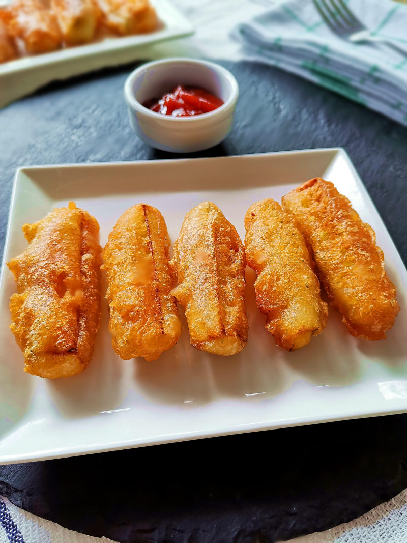 8:把带有馅料的西葫芦盒子粘上面糊