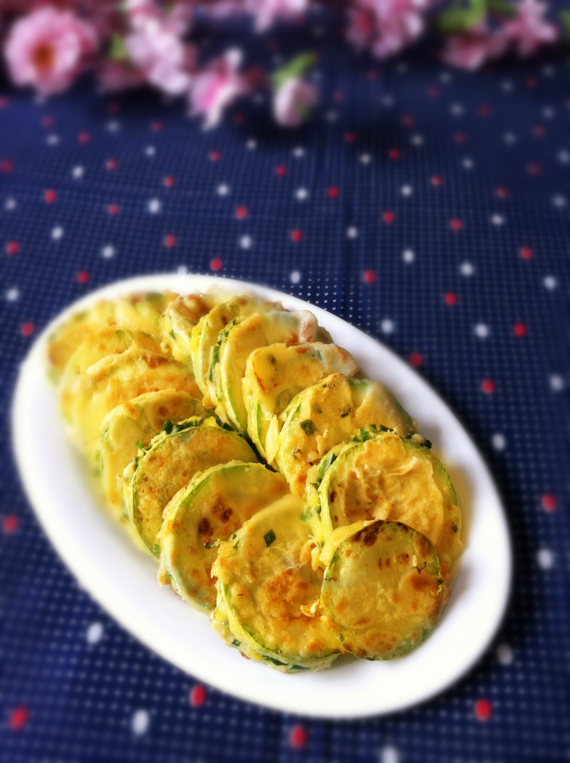 西葫芦要选嫩的。加盐稍腌一方面提前入味儿,一方面可以让西葫芦片蔫一些。鸡蛋要加些水打散,这样比较容易粘均匀。我们今天吃的是原味的,可以佐椒盐或者甜辣酱或者沙司。