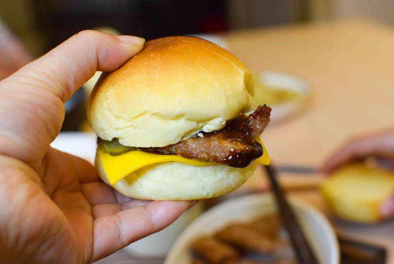 6:将煎好的牛肉放在面包上,然后趁热,放一片芝士。