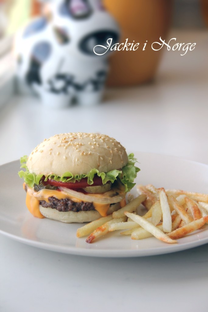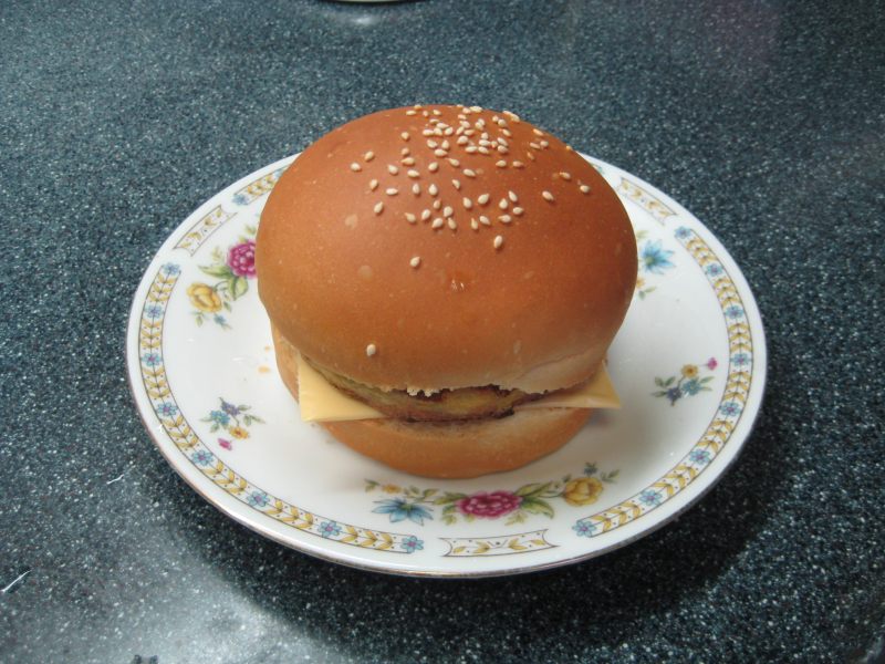 14:用锯齿刀把汉堡胚拉开两半。放一片奶酪抹上番茄酱或沙拉都可以随自己喜欢。