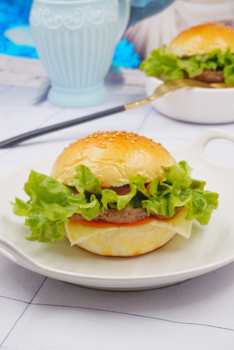 牛肉饼1块;汉堡面包胚1个;芝士片1片;生菜1片;