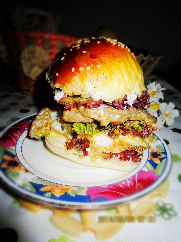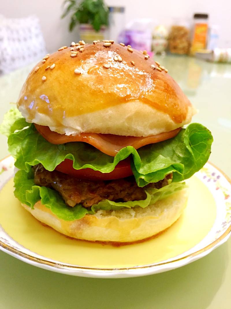 10:汉堡胚从中间横切开,在下层汉堡胚上抹上沙拉酱,依次放一片洗净的生菜叶,放上牛肉饼,放一片番茄片或几片黄瓜片,再放一层生菜叶加沙拉酱,放一片圆形火腿。盖上汉堡上胚即可食用。