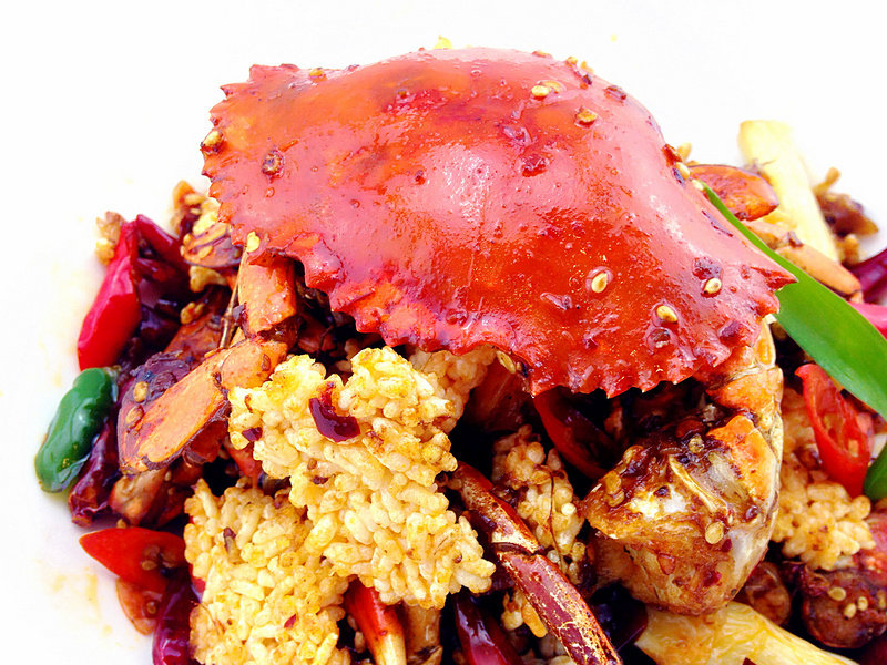 6:首先炒蟹,适当的加点水,让作料充分的包裹蟹肉;