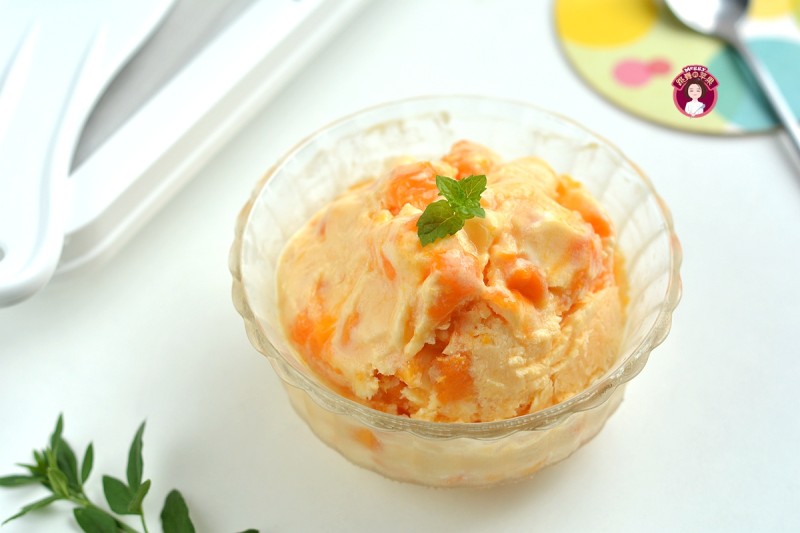 3:适量芒果西倒在凝固的酸奶冰上。