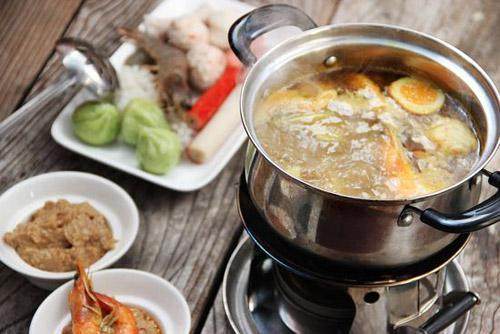 9:将制成的底料倒入火锅中,配以鱼丸、虾、蘸食小料,就可以吃一顿暖暖的火锅了。