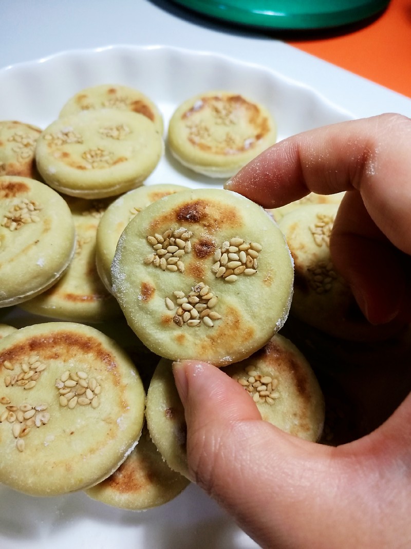 7:当小饼变固状时,可以翻面煎了,大概煎一面不用一分钟。两面煎黄就可以出锅了。