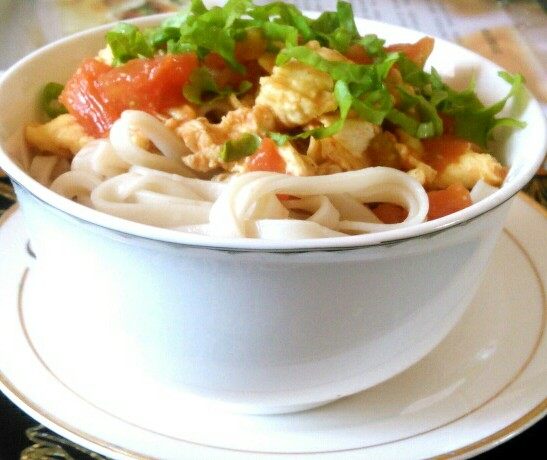 6:这时候面条已经熟了。挑出面条,淋上西红柿卤,开吃了。(因为家里没有葱了,所以我放了点生菜,其实放入小葱碎最好)