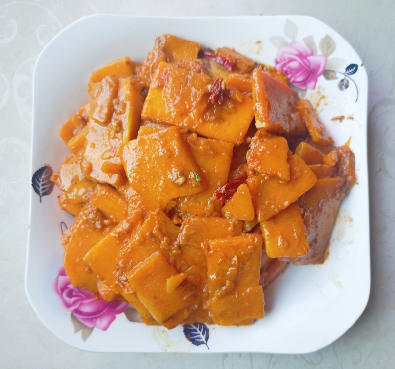 5:炒至南瓜没有硬块即可出锅装盘,外咸内甜,味道真的很好。