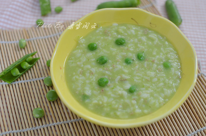 6:白粥煮好之后,加入豌豆泥和另外一半的豌豆,不停地搅拌五分钟,加适量盐调味,关火。
