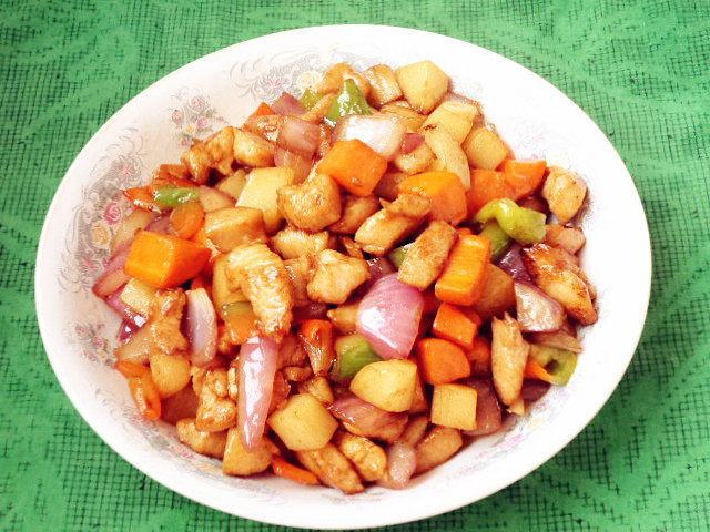 鸡胸肉300g;土豆100g;胡萝卜60g;洋葱50g;辣椒50g;